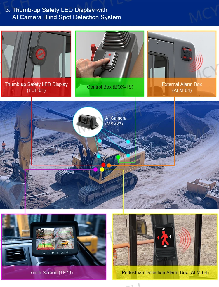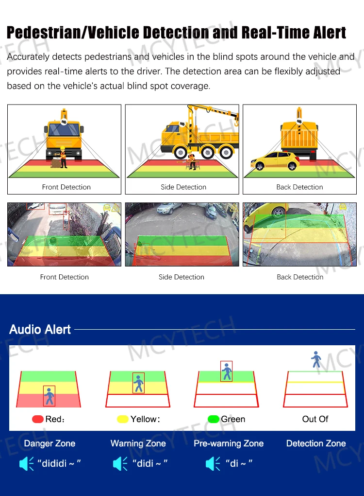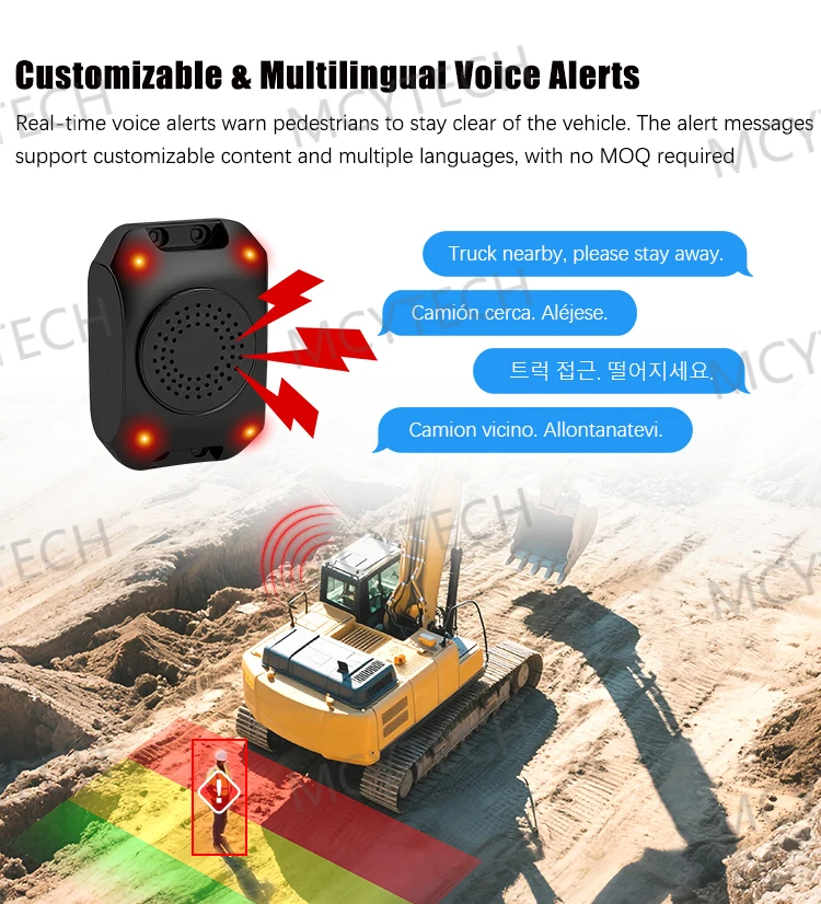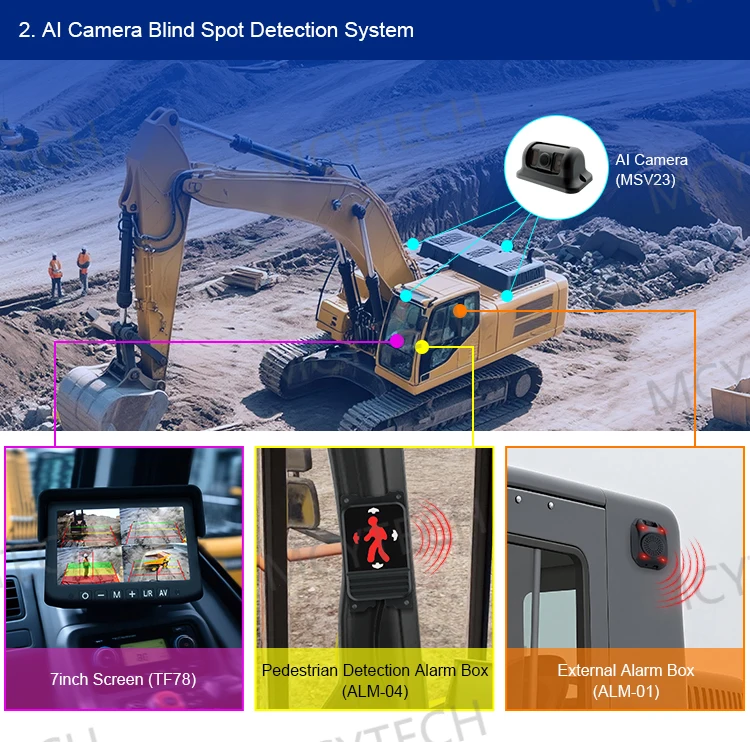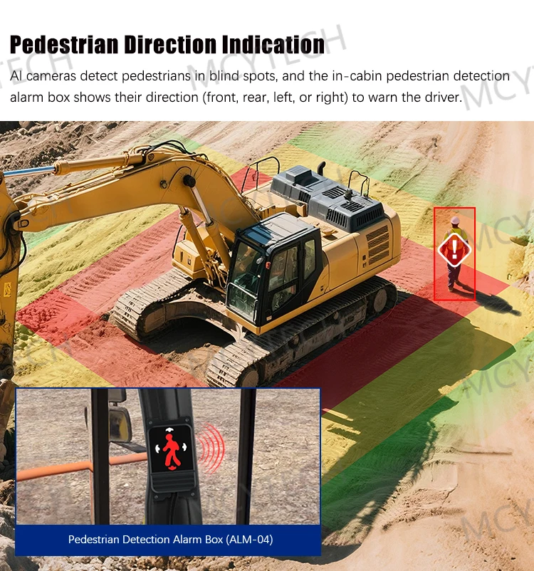 - Rilevamento AI degli Angoli Ciechi: Rileva automaticamente pedoni e veicoli negli angoli ciechi per prevenire collisioni nei cantieri.
